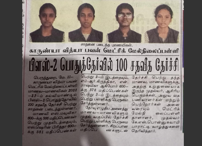 பெருந்துறை குறுமைய அளவிலான கையுந்து விளையாட்டு போட்டியில் இளையோர் மாணவர்(U-14) பிரிவில் முதலிடமும் மூத்தோர்(U-17) மாணவர் பிரிவில் முதலிடமும் பெற்று மாவட்ட அளவிலான விளையாட்டுப் போட்டிக்கு காருண்யா வித்யா பவன் மெட்ரிக் மேல்நிலைப்பள்ளி மாணவர்கள் தகுதி பெற்றுள்ளனர் என்பதை மகிழ்ச்சியுடன் தெரிவித்துக் கொள்கிறோம். இப்படிக்கு முதல்வர், ஆசிரியர் பெருமக்கள் மற்றும் உடற்கல்வித்துறை காருண்யா வித்யா பவன் மெட்ரிக் மேல்நிலைப்பள்ளி பெருந்துறை